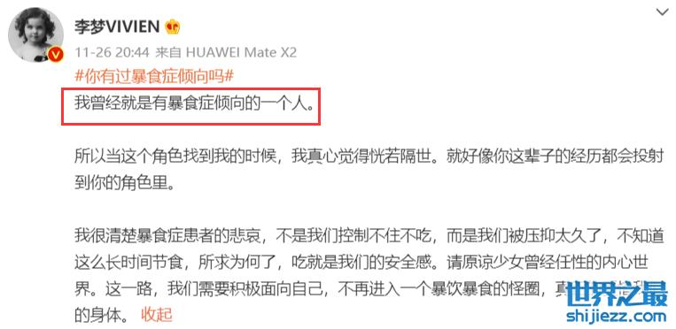 李梦表示,她很清楚暴食症患者的悲哀,不是控制不住不吃,而是被压抑了太久已经不知道这么长时间节食所求为何了,所以吃就变成了安全感。