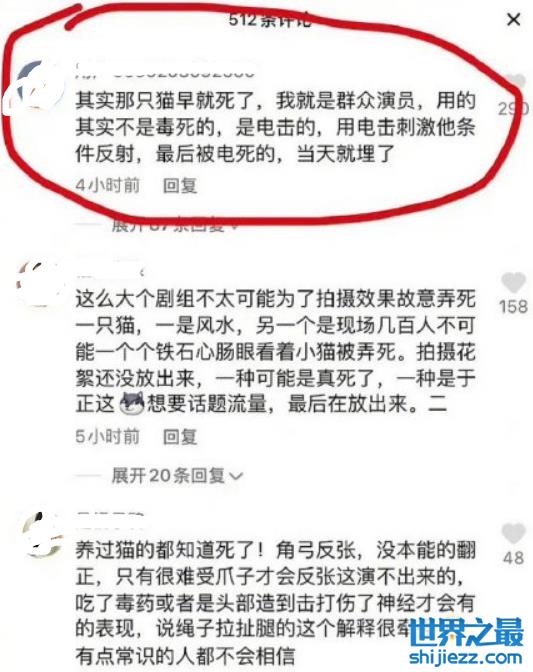 这位自称群演的网友爆料称,那只猫咪早就死了,而且不是被毒死的,是被电击的,用电击刺激猫咪条件反射,最后被电死的,当天就埋了。