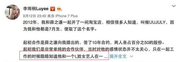 2012年,薛之谦和李雨桐的事情闹得沸沸扬扬的时候,李雨桐其中一次爆料发文里就提及过一位L姓女艺人。