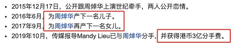 此后两年,刘碧丽先后为周焯华再生一双儿女,感情一直比较稳定。直到2019年10月,两人被媒体爆料分手,刘碧丽还获得3亿港币分手费。