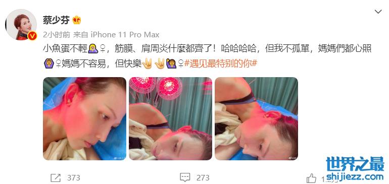 11月29日,女星蔡少芬发布微博,晒出了自己作针灸的照片。蔡少芬配文称:“小鱼蛋不轻,筋膜、肩周炎什么都齐了!哈哈哈哈,但我不孤单,妈妈们都心照。妈妈不容易,但快乐”。