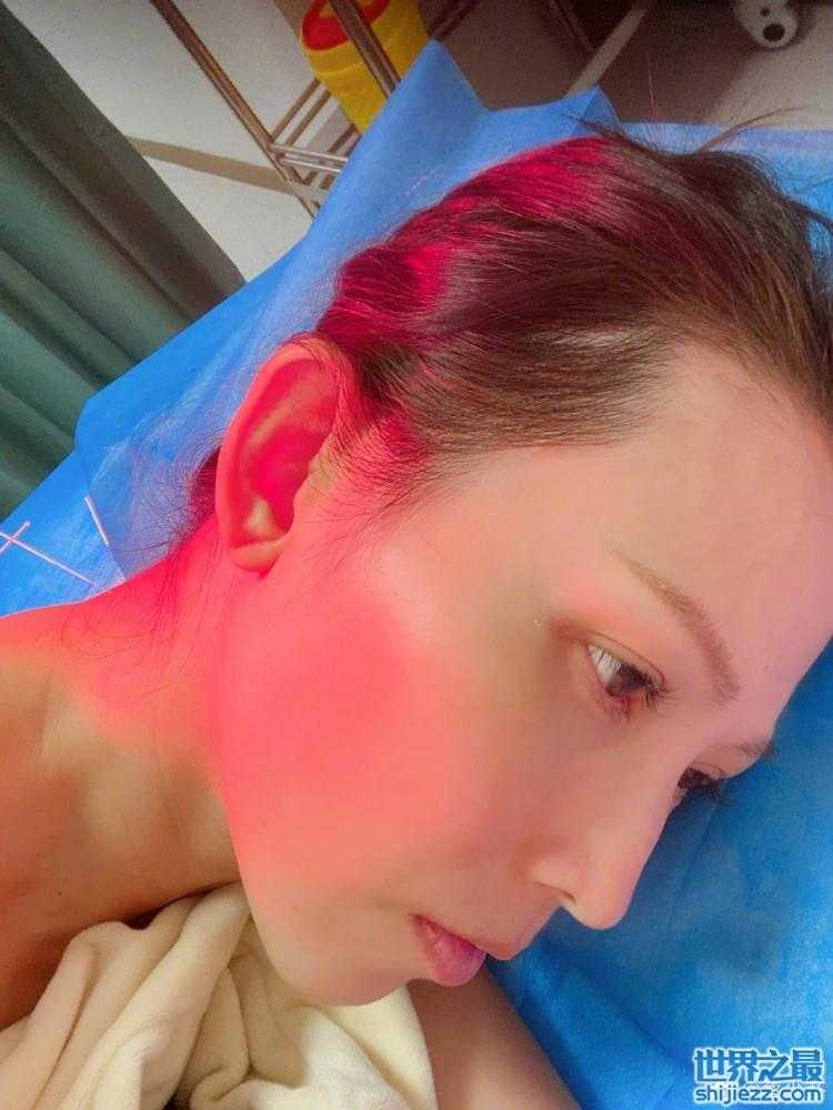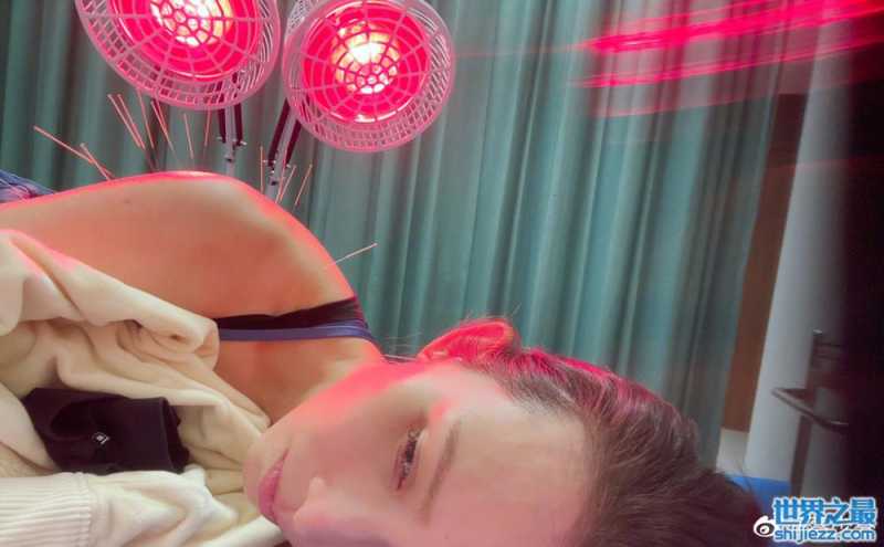 照片中的蔡少芬,躺在床上正在做理疗,可以清楚地看见她的脖子上、肩膀上都插满了针,看来肩周炎真的很厉害了,希望做针灸能够缓解她的疼痛。