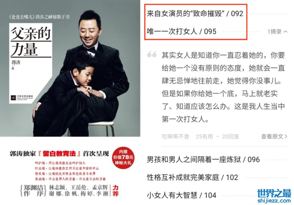 而他严厉的父亲形象也给了观众比较深的印象,可能是尝到了“石头爸爸”这个标签的甜头,他趁热打铁出了一本名为《父亲的力量》的书。明明书名说的是父亲,郭涛却在书里大谈他对女性的见解。