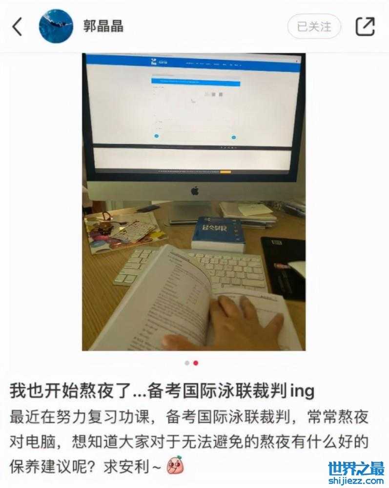 哈哈,一个世界冠军竟然是这般的努力。原来是郭晶晶为了努力考国际泳联的裁判,于是就熬夜学习以前的游泳知识。