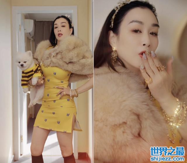 “变身”之后的钟丽缇穿着一件黄色紧身包臀裙,将凹凸有致的身材展示地淋漓尽致。从视频中看,钟丽缇两个手上都戴满了黄金,手指上也有好几个黄金戒指,显得整个人贵妇范十足。