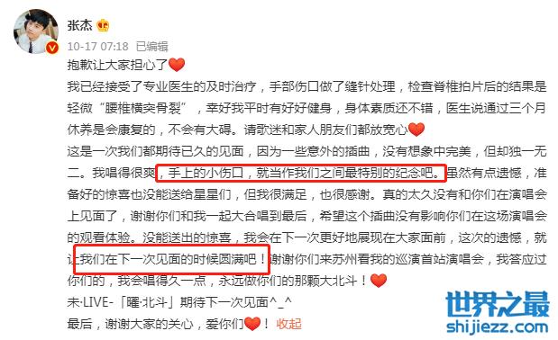 从现场粉丝拍摄的视频看来,当时张杰做了简单处理后继续嗨唱3小时,但大屏幕上清晰可见他的手部一直在流血。