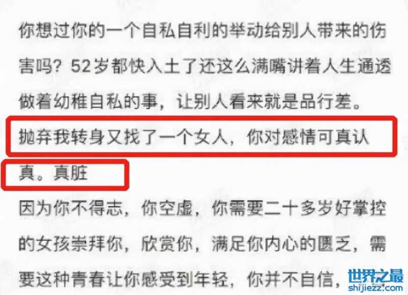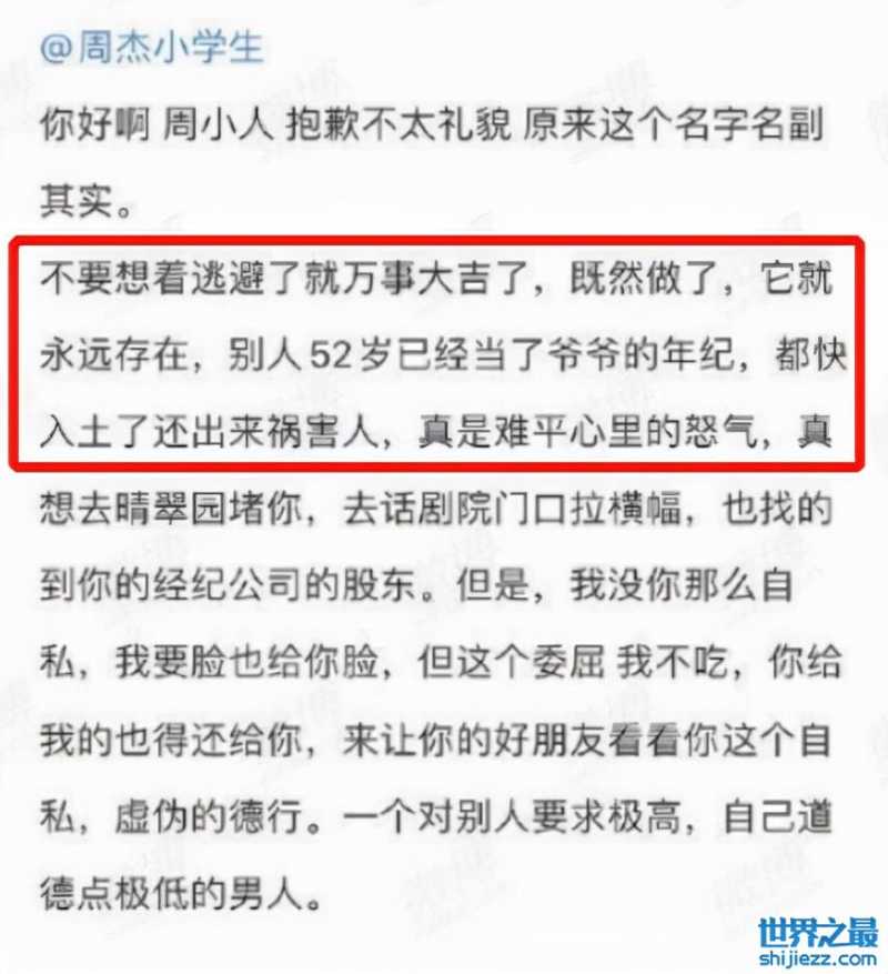 她语气还挺激烈的,开篇就直接就是一句“周小人”,接着又嘲讽他52岁快入土了还出来祸害人。