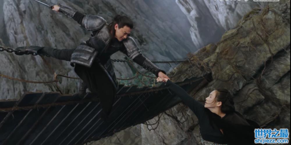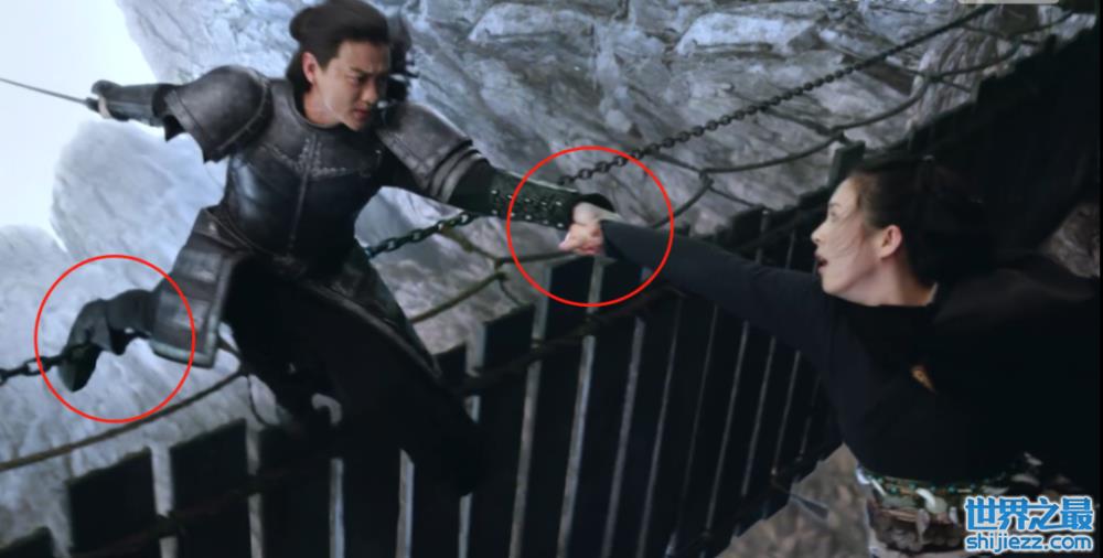 年初章娘娘周一围主演的《夕阳赋》,哦不,《上阳赋》中也有一段相当反物理操作的掉崖桥段,章子怡被反派拽下吊桥差点掉下悬崖,周一围饰演的萧綦眼疾手快,直接用脚勾住铁链,一把拽住了章子怡!