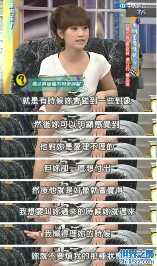 杨丞琳说在那段感情中自己很受伤,她和邱泽两个人交往了8个月,但见面却不到10次,杨丞琳想联系他的时候,邱泽还爱答不理。这段感情中杨丞琳一直是处于卑微的一方,经常低三下四。