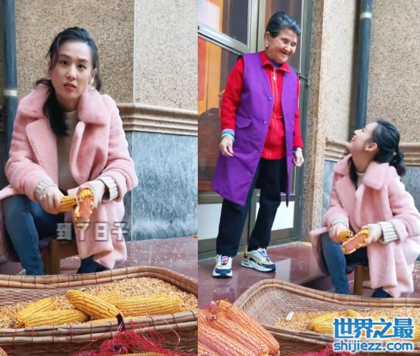 时而,黄圣依干脆打扮成一个村妇形象,头发随意地绑在脑后,身上穿着粉色保暖的毛绒外套搭配一条深色牛仔裤,坐在家门口麻利地掰起了玉米。看来黄圣依自己还是没少在家干活的。