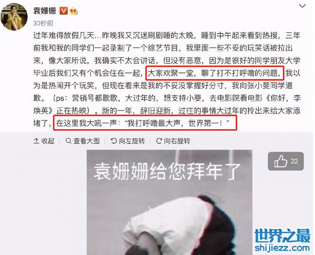 节目外,张小斐发文澄清自己并不打呼。 结果袁姗姗在底下评论,“打呼怎么了,又不犯罪”,令人无语。