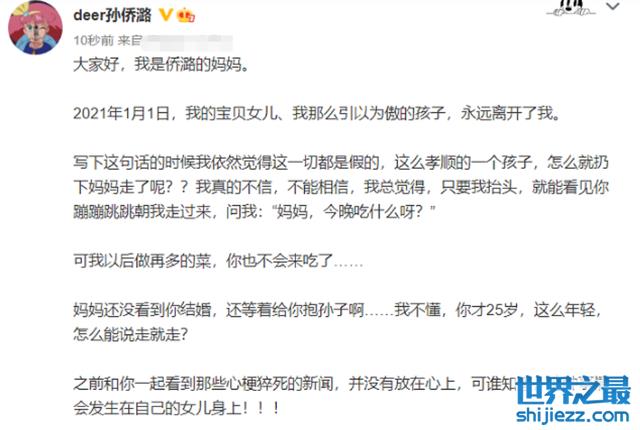 在2021年年初,孙侨潞的妈妈在社交平台发布长文,告诉大家自己的孩子因心梗猝死了,而当时她才不过25岁。