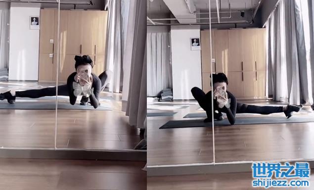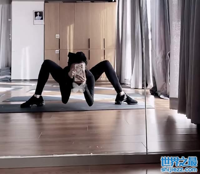 而她的身体一直保持着与地面平行,手上稳稳当当地拿着手机。此外,金巧巧还做了两个压腿动作,一条腿尽量压得与地面平行。她还提到,这个动作能够瘦腿。