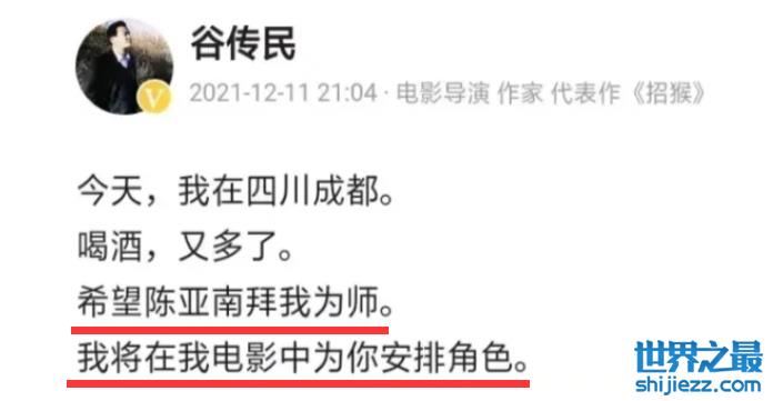 可见,谷传民对大衣哥的确颇有微词,而在动态中,谷传民则表示自己理解陈亚男的作为,还希望陈亚男可以拜自己为师,自己会在新电影中为她安排一个角色。另外,谷传民就济南电台主持人劲彬恶评陈亚男一事也公开发声力挺陈亚男。