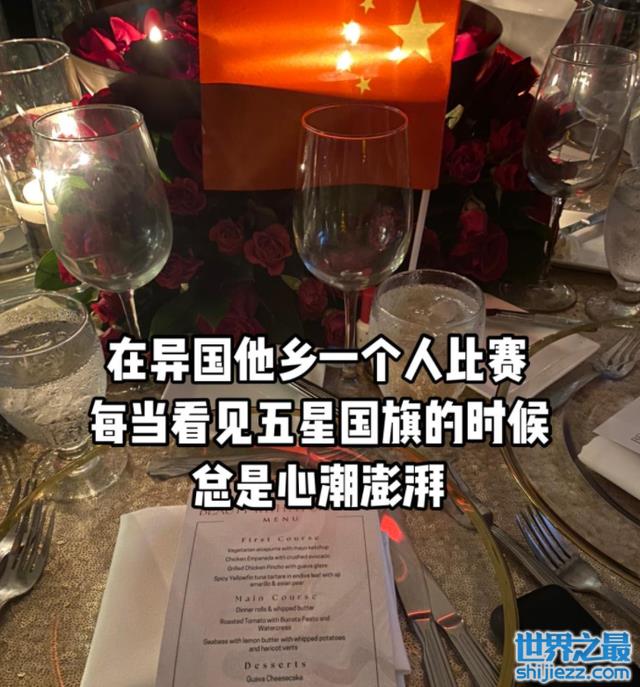 姜思岐还特地给了桌上的中国国旗一个特写,还在视频中写道:“在异国他乡一个人比赛,每当看见五星红旗的时候总是心潮澎湃。”