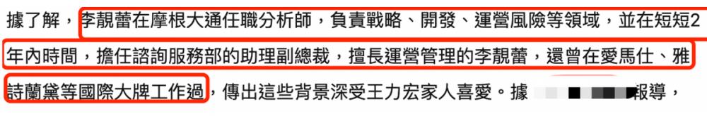 通过了解得知,李靓蕾在分析,战略,开发,运营风险等领域拥有丰富专业技巧,并且在运营管理等方面能力极强,在大牌工作过的她在职场上并不胆怯并且拥有丰富的经验,因此她想要插手王力宏的事业也不言而喻了。