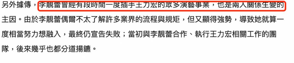 据台媒报道,两人离婚的另一原因是前妻李靓蕾曾想插手王力宏的许多演艺事业,而她不懂流程又强势的做法让许多合作的人员离开团队,造成了许多损失。