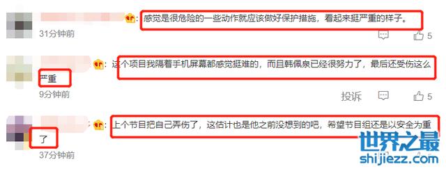 韩佩泉参加的这档综艺是属于运动竞技类型,由于并不是专业的运动员参与,也曾多次发生过类似的艺人受伤事件。