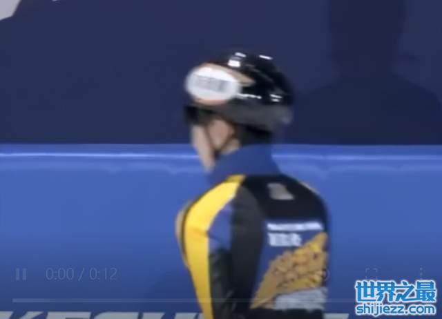 视频中,韩佩泉穿一身正规的速滑衣,戴着贴着自己名字的头盔,他在听到开始一声令下,便开始认真地滑动,动作很是标准。
