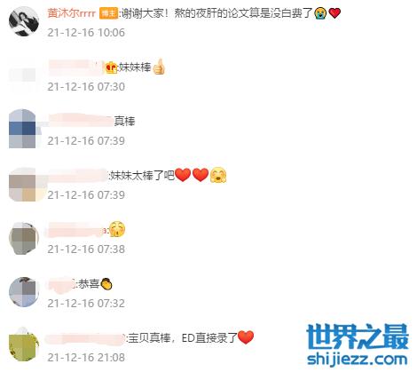 动态下面的评论区大家都纷纷表达了对她的祝福和夸赞,黄沐尔也对大家的祝福表示了感谢,并称自己熬夜肝的论文没有白费,由此看来黄沐尔真的是非常努力。