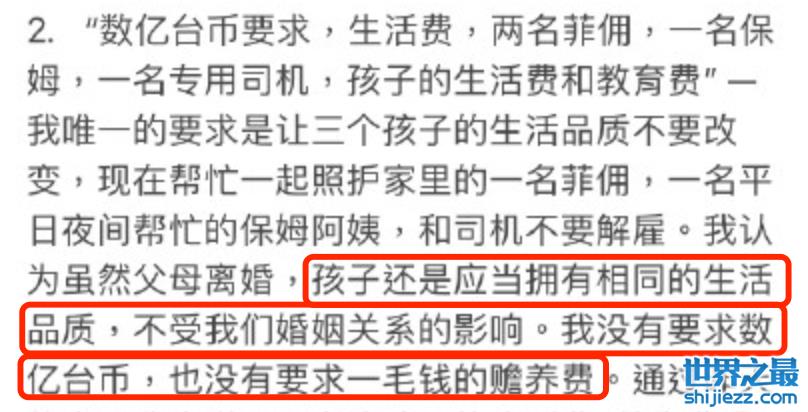 随后,李靓蕾还表示自己并无过分要钱的行为,而是保证小孩们的生活质量,就连孩子的赡养费都是自己一个人承担。