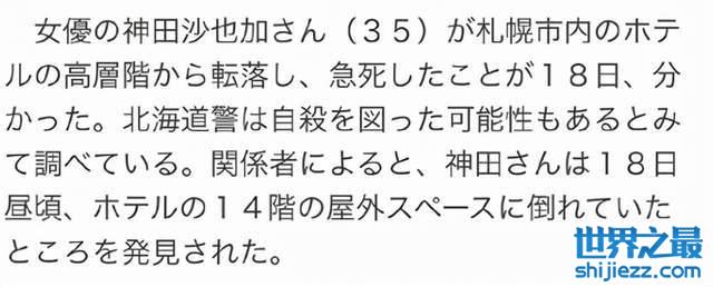 近日,据日媒报道,日本歌手神田沙也于18日在北海道一家高层酒店坠楼,经抢救无效死亡,年仅35岁。目前神田沙也一事被警方判定是一起自杀事件,警察仍还在调查中。