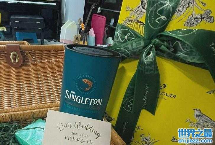 而在箱子的外面,则是还有一个黄颜色包装的礼盒,这一个礼盒比较大,上面扎着礼盒花,应该是独立放送出来的,不知道这盒子里面是不是包着魏晨和于玮的喜糖。