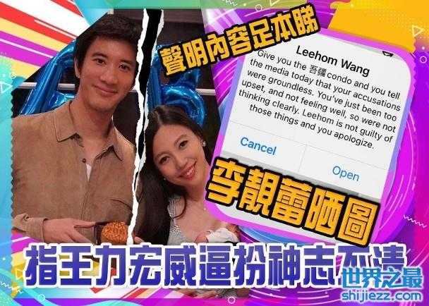 另外,李靓蕾公开王力宏发的短信,对方要求她以“精神不清”为由为他洗白,给出的条件是给她现在所住的房子,但遭到李靓蕾的拒绝,从而曝光了更多不为人知的内情,也喊话王力宏下午三点公开道歉,否认控告王力宏及父亲诽谤,双方彻底撕破脸。