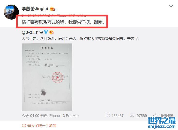 李靓蕾在17日晚上,突然上线发长文痛诉王力宏,控诉王力宏种种不轨的行为,而by2妹妹Yumi被指是小三,气到工作室连夜报J,没想到李靓蕾直接转发其工作室博文,回呛:“请把警察联系方式给我,我提供证据,谢谢”,这就把矛头指向了孙雨本人。