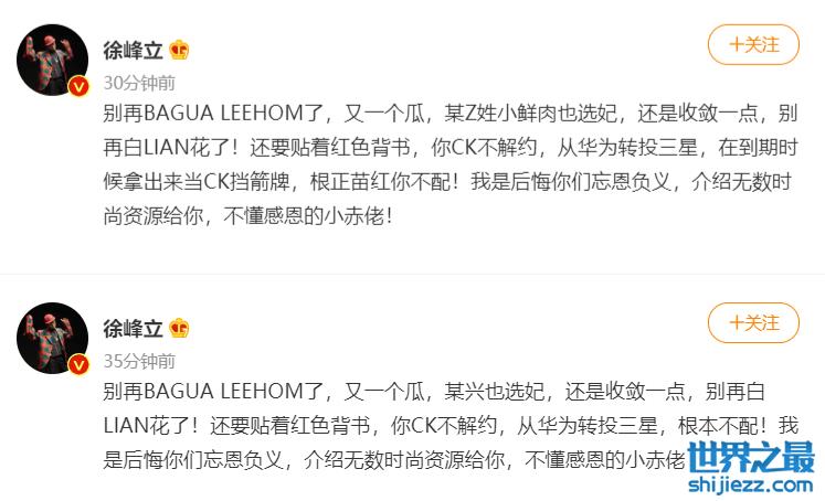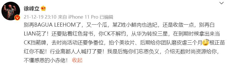 在徐峰立给出的提示中,他提到“你CK不解约,从华为转投三星,在到期时候拿出来当CK挡箭牌,去时尚活动还争番位,拍个美妆片,后期团队磨皮要三个月,根正苗红你不配,行业里都人人喊打了要。”