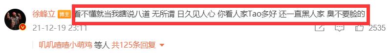 在徐峰立爆料的动态下,他又一次提到了黄子韬,直言看不懂的就当他胡说八道,无所谓,反正日久见人心,你看人家韬多好,还一直黑人家。