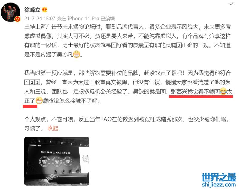 另外,在今年7月份,徐峰立还公开对黄子韬、张艺兴等人公开评价,当时他评价张艺兴太正了,另外对黄子韬一顿猛夸,觉得黄子韬人很真实,也非常耿直,喊话让品牌方找黄子韬代言。7月份还对张艺兴的评价非常高,为何不到半年的时间就改口爆料了呢?是造谣还是真的知道什么内情呢?
