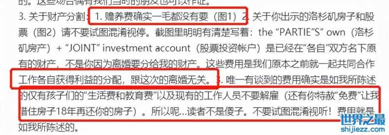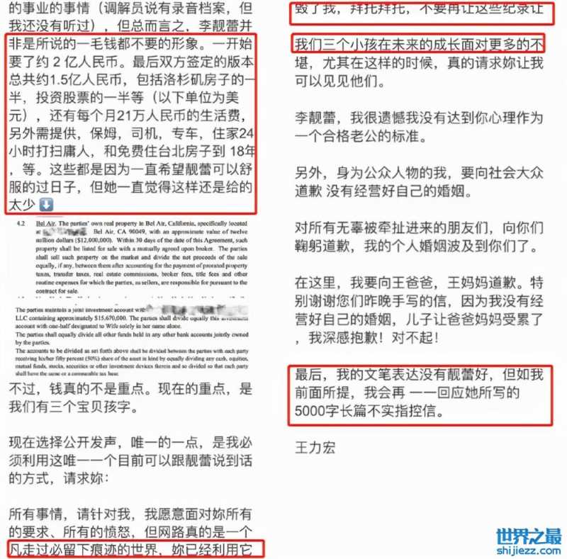 其次,关于财产分割问题,李靓蕾表示自己没有要赡养费。而所谓的王力宏在美国的房子和股票是李靓蕾之前和他一起合作工作各自获得的利益分配,并不是王力宏给她的,和这次离婚无关。而唯一的费用仅仅是三个孩子的生活费和教育费,雇佣保姆、司机的费用,以及“借住”18年的房子。