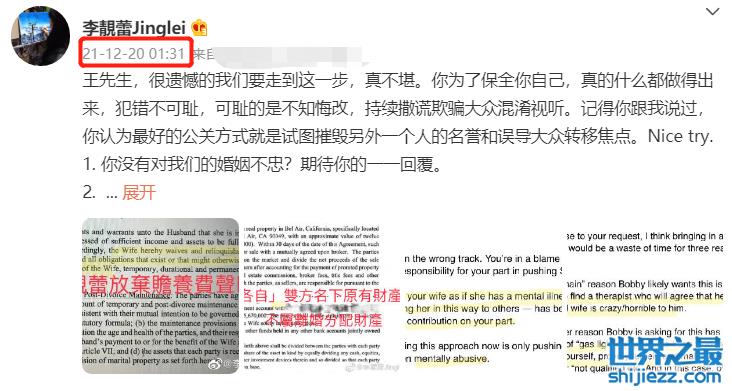 他首先指责妻子的日文名字,此次声称被李靓蕾以怀孕的名义逼婚。另一张图片里他认为前妻索要2亿太贪心,希望李靓蕾能够停止发文,不要毁了他和孩子。