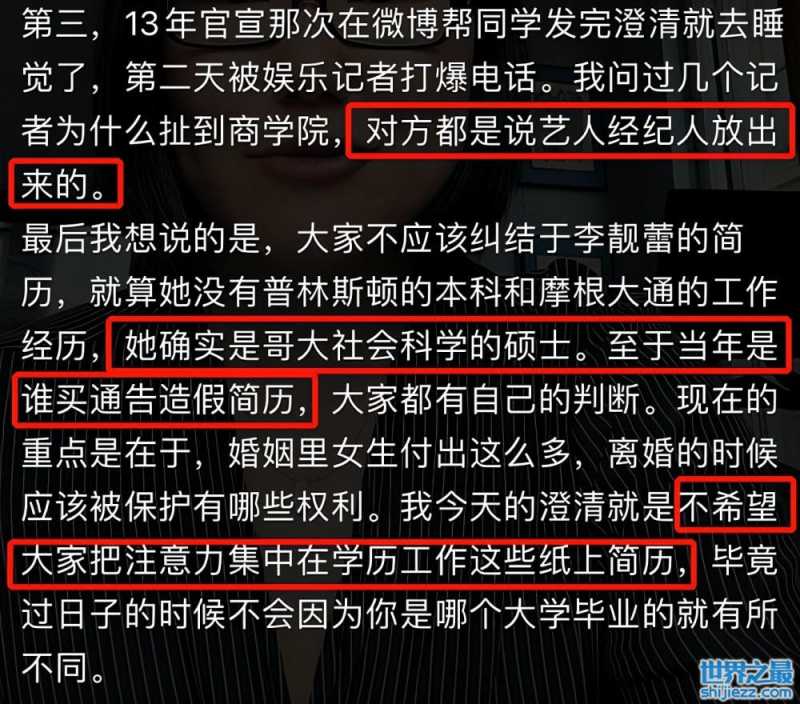 吴卡莉明确表示李靓蕾是哥大硕士是不争的事实,但本科是普林斯顿然后在摩根大通工作后来哥大读MBA的人确实不是李靓蕾。不过随后吴卡莉也表示yeshiva是不错的大学,只是在国内知名度较低,所以李靓蕾的高学历是不争的事实。