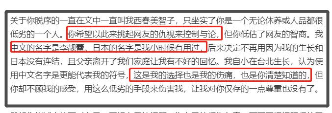 接连5问之后,李靓蕾随后还陆续补充了不少细节,还解释了王力宏口中的“西春美智子”的来龙去脉。