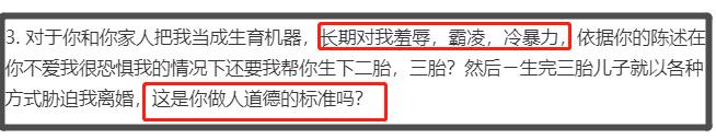 第三,家族把自己当生育机器,长期羞辱霸凌冷暴力,你承不承认?并且问出了网友在看完王力宏回应“长期被威胁”的文之后大家想知道的事:为什么恐惧之下还能跟妻子生三胎?