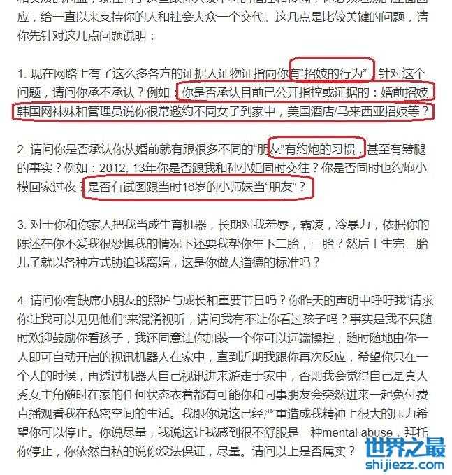 例如:你是否承认目前已公开指控或证据的:婚前招妓韩国网袜妹和管理员说你很常邀约不同女子到家中,美国酒店/马来西亚招妓等?