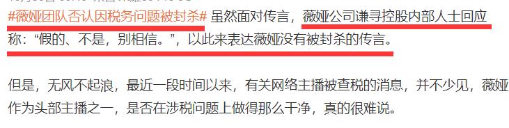 实际上,早在10月29日,就有圈内人士爆料,薇娅涉及税务问题恐将被封杀,其相关的专访文章都要勒令下架,同时直播行业也将进行全面整顿,当时薇娅背后的谦寻公司则表示,传闻均不属实,让外界网友不要轻信谣言。