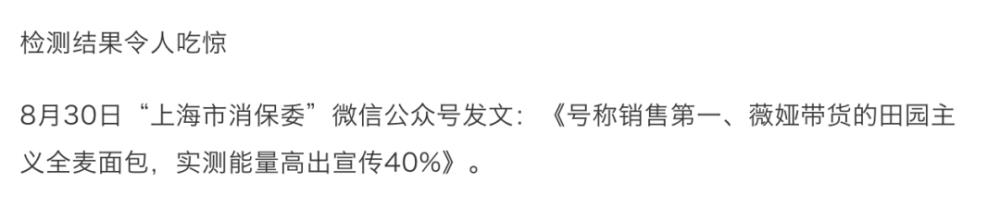 除了卖假货之外,薇娅推荐的号称能量很低,具有减肥作用的全麦面包,经过专业检测之后,实测能量高出宣传百分之四十,直接被上市消保委发文点名批评。