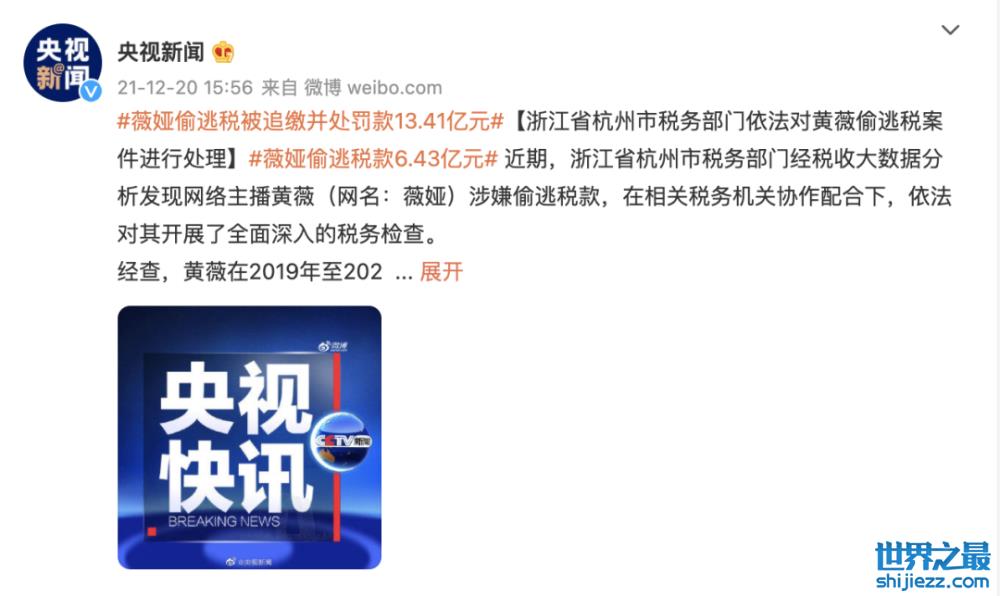 央视新闻官博发博称, 经查,黄薇(薇娅)在2019年至2020年期间,通过隐匿个人收入、虚构业务转换收入性质虚假申报等方式偷逃税款6.43亿元。