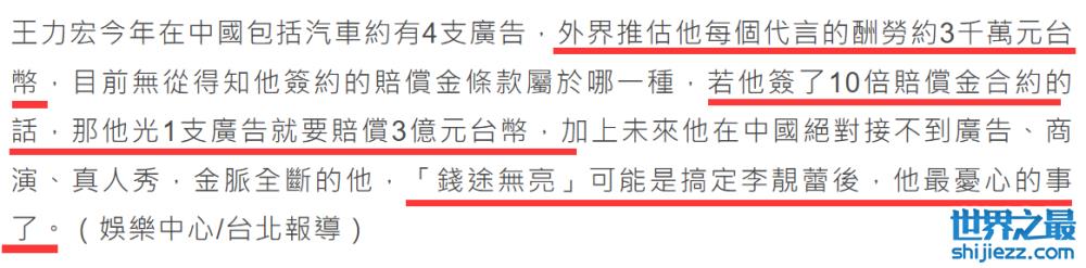 另外,台媒还报道称,除了巨额赔偿外,王力宏未来恐怕很难再接到广告、商演、真人秀等,“钱途无亮”可能是王力宏搞定李靓蕾后,让他最担心的事了。