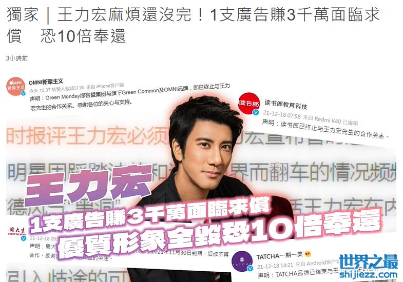 因为艺人塌房的事件频繁发生,所以艺人与广告商签约代言时,都会附加条款,就是一旦艺人发生有损形象的行为,厂商则要求赔偿,也是为了约束艺人的行为,外界推估王力宏的每个代言的酬劳约为3千万台币(约687万),如签了最高10倍赔偿金的话,王力宏1支广告就要赔偿6870万,4支广告的巨额赔偿就要高达2.7亿元(12亿台币)。