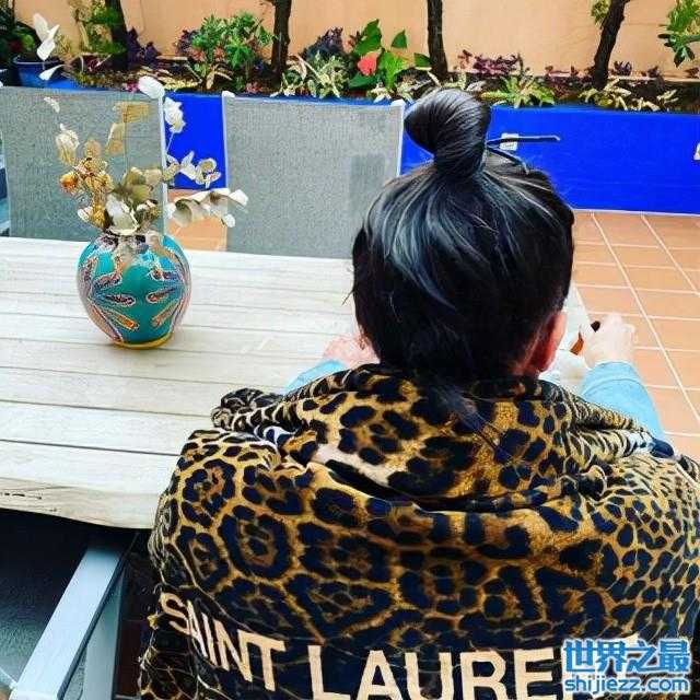 老公陈子聪也出现在何超仪的镜头之中,只是老公身上应该是披着一件豹纹的貌毯,然后认真地在摆弄着手里的东西。