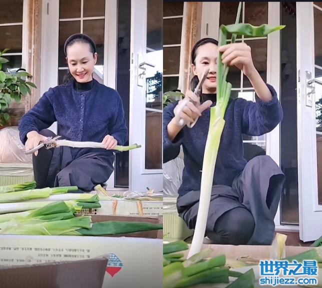于文华将扎着头发,上面穿一身深蓝色绒衣,下面穿深灰色长裙,双腿还套了黑丝,性感又优雅。只见于文华半蹲在豪宅前,一只手拿起大葱,一只手拿起剪刀,动作十分娴熟干练的整理大葱,脸上洋溢着喜悦之情。