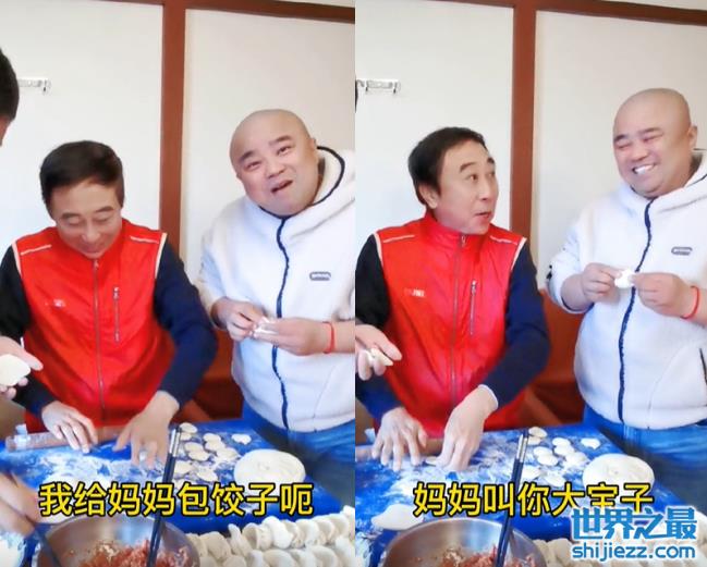 白色衣服的徒弟捏起饺子皮,一脸笑容看向冯巩问他道:“我给妈妈包饺子呢?”冯巩停下手中的动作,抬起头瞟他一眼笑道:“妈妈叫你大宝子”,连旁边另一个徒弟也被俩人的对话给逗笑。