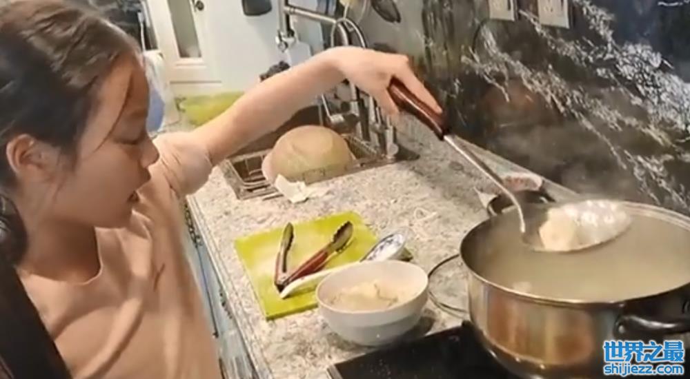 也有明星带着自己的儿女一起包饺子、煮饺子。我们可爱的小甜馨就在灶台这边开始煮起了饺子。只见煮锅旁边的灶台上,摆放着砧板,应该是放置饺子的地方,台面上有些凌乱。甜馨一点一点把饺子捞上来,然后加上配料。