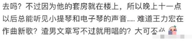 但是,该事件的重点就在于王力宏深夜弄出的噪音。该网友透露王力宏的套房就在楼上,还抱怨道“所以晚上十一点以后总能听见小提琴和电子琴的声音”,大骂“渣男文章写不过就用唱的”,看得出王力宏现在人缘很差。