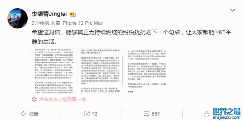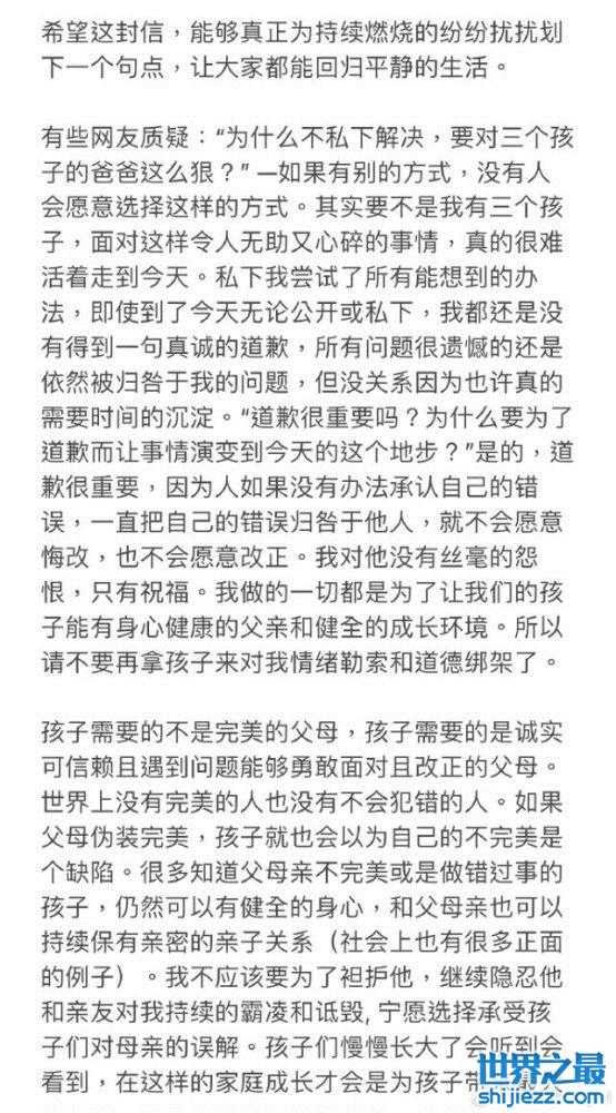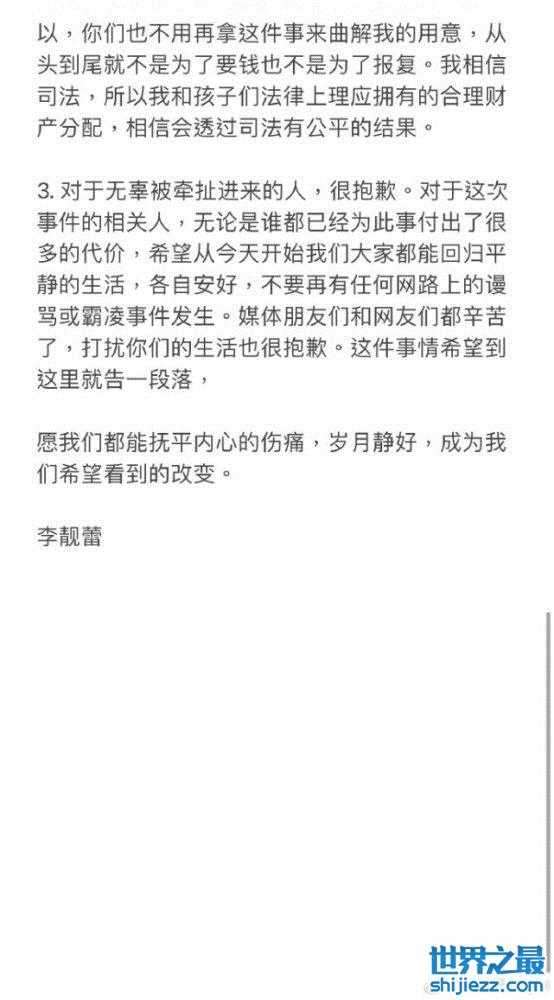 12月23日,李靓蕾再一次对外公开发文,并且对自己为什么要逼着三个孩子的父亲走绝路,她首次公开解释了为什么要撕王力宏的理由。
