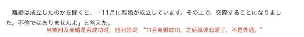 并且男方在被日媒记者问及关于离婚的情况时,男方表示“11月离婚成功,之后就谈恋爱了,不是外遇”